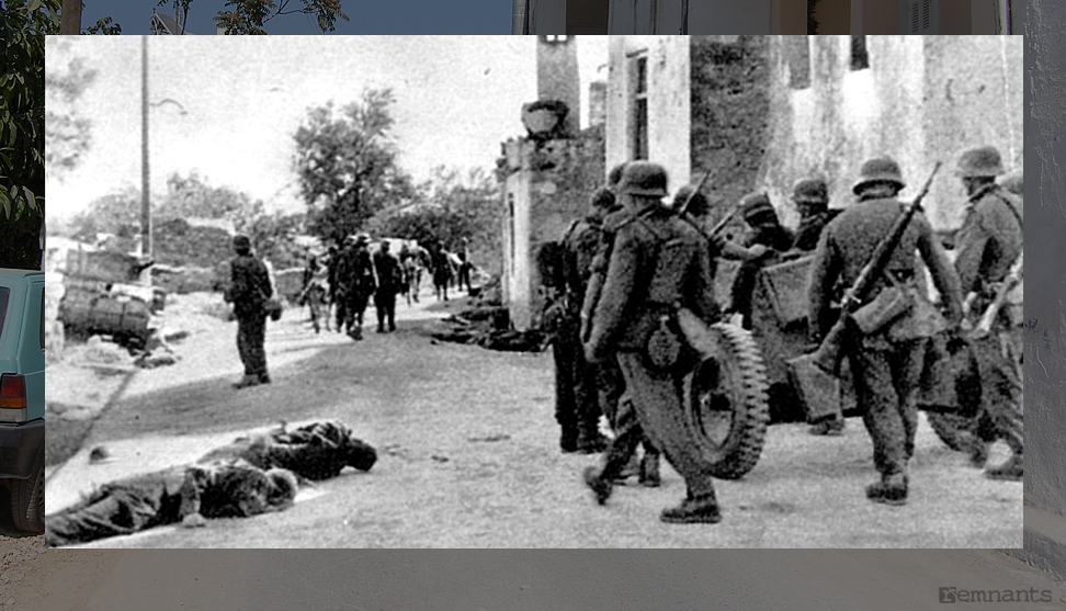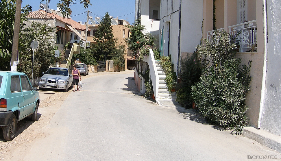 Galatas, 2009. Facing north in the main north-south village road. Note the white building on the right and position of the wooden post on the left.