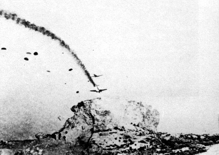 Heraklion, Crete. German paratroops of FallschirmJager-Regiment I use their parachutes to descend from Junkers JU52/3M transport aircraft shot down by anti-aircraft fire. This photograph, from a cine sequence shot in the evening at about 1800 hours, shows paratroops of 6. and 7. Kompanies of the II. Battalion, still jumping from a blazing JU52 just west of the Heraklion airfield onto positions defended by the Australian 2/4th Infantry Battalion. 20 May 1941.