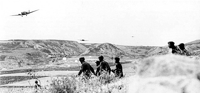 A photograph showing Ju-52s dropping paratroops into a shallow valley (possibly Prison Valley meaning that the troops are from the 3rd Fallschirmjager Regiment) [sic] and illustrates in stark terms how low the “low altitude” drops really were. (B.L. Davis Collection). May 1941.