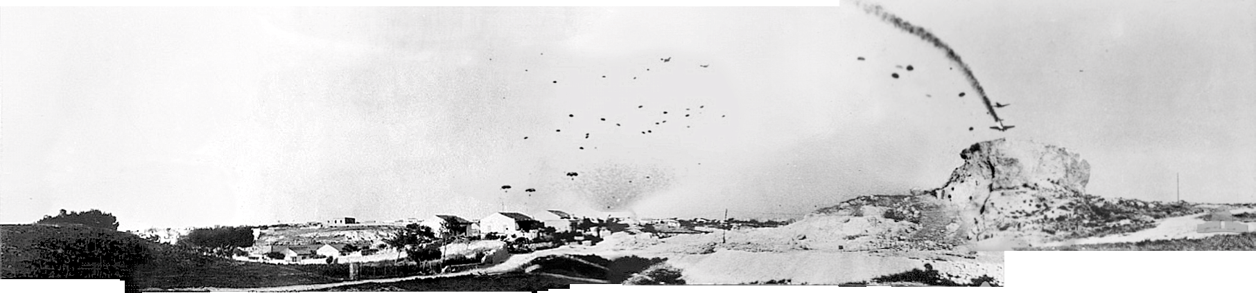 Composition made using parts from 17 archive images, showing elements of Regiment 1 drop to Heraklion airfield on the afternoon of May 20 1941. The shots were taken in the area of 14th Brigade HQ, the rock formation on the right.