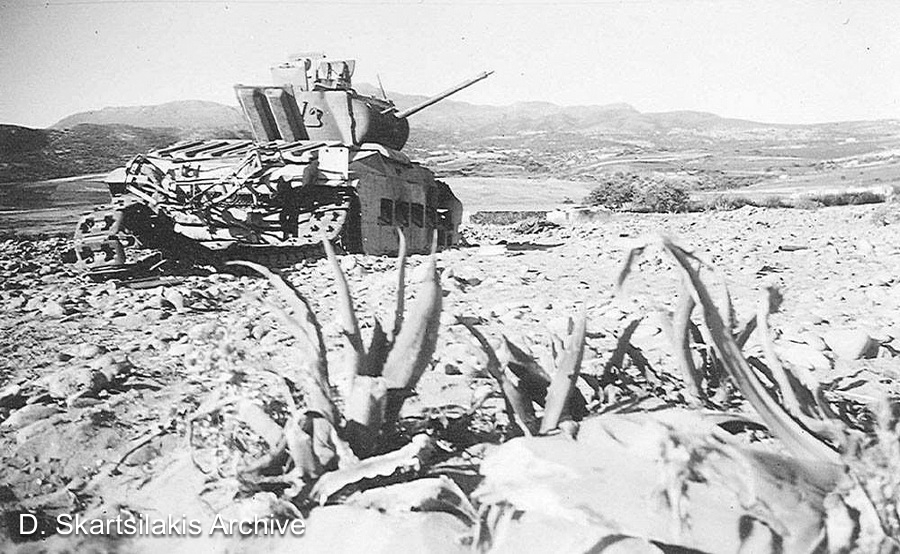 “Gnome” was one of the two tanks used on the Austaralian attack on the Morning of 27 May 1941 against the German positions in Perivolia. It was immobilized after a direct hit from an LG40 100mm recoilless gun, some 60m east of the German line. The tree cluster on the distant right was housing a German stronghold on the outer perimeter.