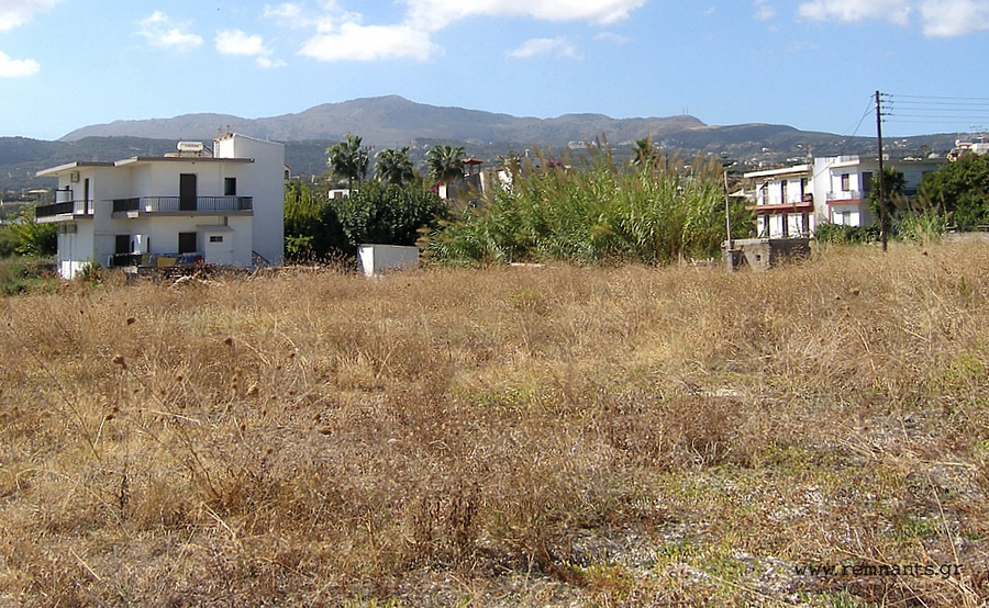 Parts of the once open field are today occupied by the expanding Perivolia settlement. The irrigation walls ahead of the tank visible on the archive image are still present, though hidden under vegetation.